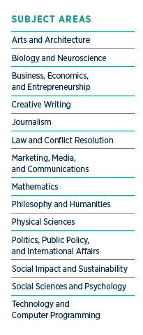 Students choose from 16 subject areas, ranging from STEM and business to humanities and the arts. The programs’ renowned instructors bring real-world expertise to their teaching, offering students an in-depth understanding of complex topics. Each student will be challenged to explore the heights of their potential. They’ll be encouraged to think critically and solve problems in small class sizes that facilitate engaging discussions and provide personalized guidance.