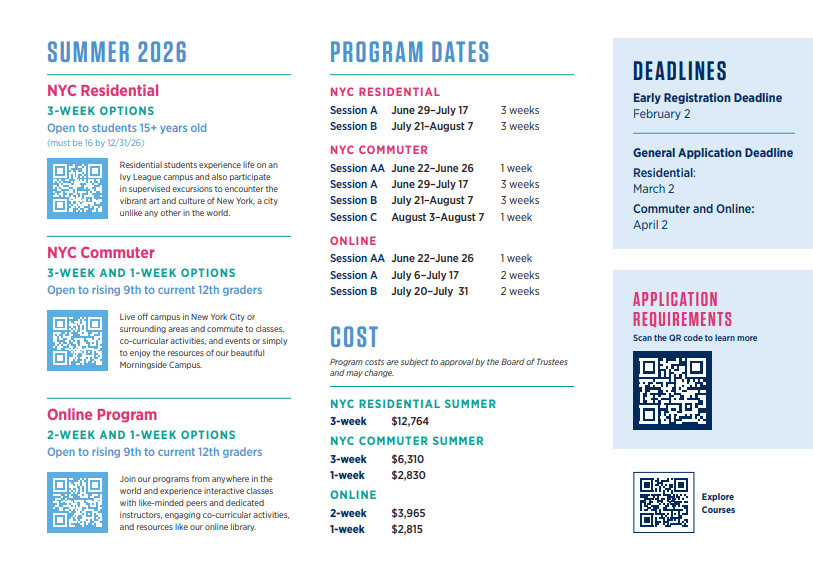 Students in grades 9-12 may participate online or in person. Residential options are available for students aged 15 years or older. Students applying for the residential program must be at least 16 years old by the end of the calendar year in which they participate in the program.